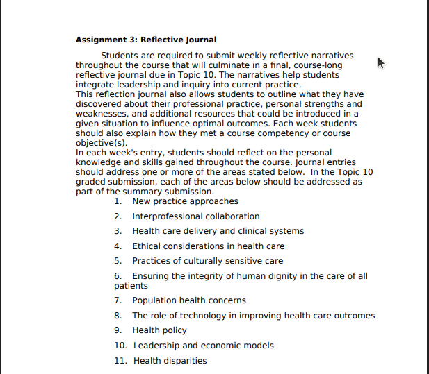 Students are required to submit weekly reflective narratives throughout the course that will culminate in a final, course-long reflective journal due in Topic 10. The narratives help students integrate leadership and inquiry into current practice. This reflection journal also allows students to outline what they have discovered about their professional practice, personal strengths and weaknesses, and additional resources that could be introduced in a given situation to influence optimal outcomes. Each week students should also explain how they met a course competency or course objective(s). In each week's entry, students should reflect on the personal knowledge and skills gained throughout the course. Journal entries should address one or more of the areas stated below. In the Topic 10 graded submission, each of the areas below should be addressed as part of the summary submission. 1. New practice approaches 2. Interprofessional collaboration 3. Health care delivery and clinical systems 4. Ethical considerations in health care 5. Practices of culturally sensitive care 6. Ensuring the integrity of human dignity in the care of all patients 7. Population health concerns 8. The role of technology in improving health care outcomes 9. Health policy 10. Leadership and economic models 11. Health disparities